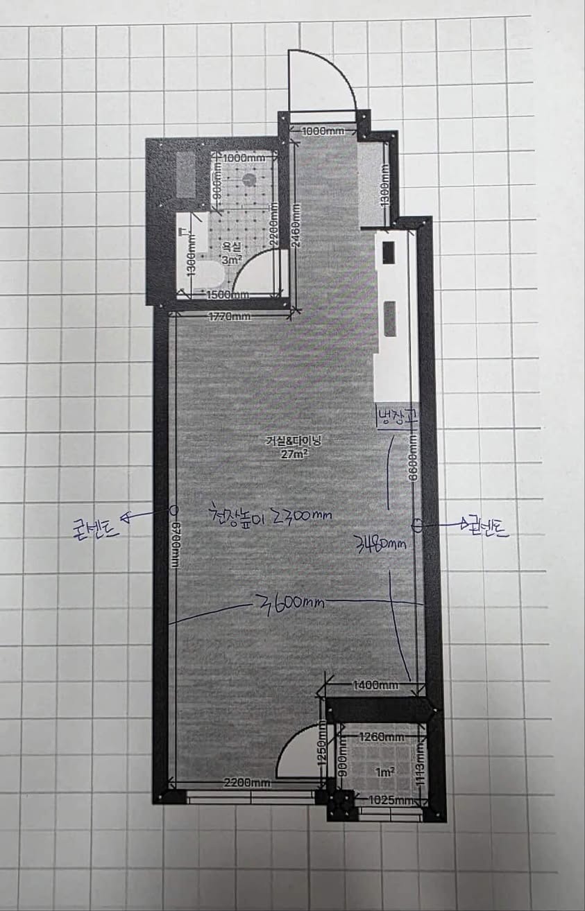 티비는 화장실벽에 놓고 맞은편 쇼파로 침실구분함 되겠다